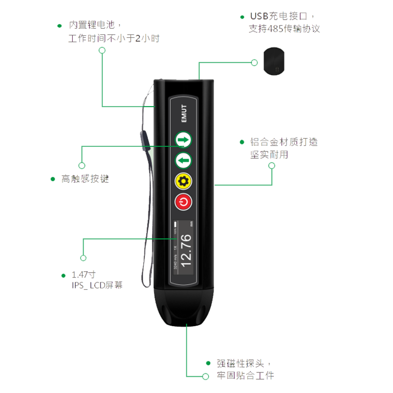 EMUT6500笔式电磁超声测厚仪是一款超小型的无需耦合剂 、可非接触式测量的仪器,